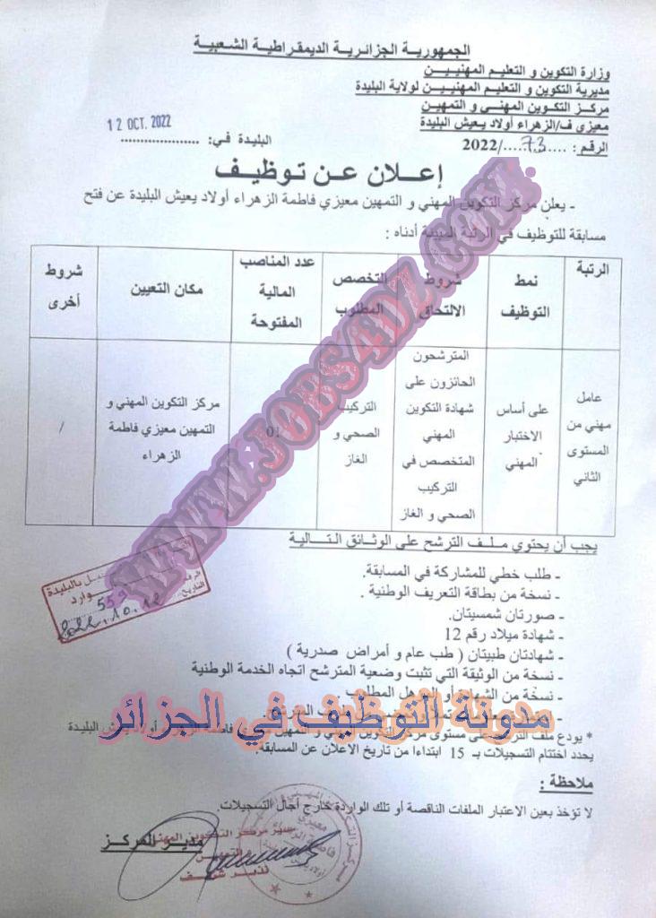 يعلن مركز التكوين المهني والتمهين معيزي فاطمة الزهراء البليدة عن فتح توظيف على اساس الاختبار المهني في الرتب المبينة ادناه