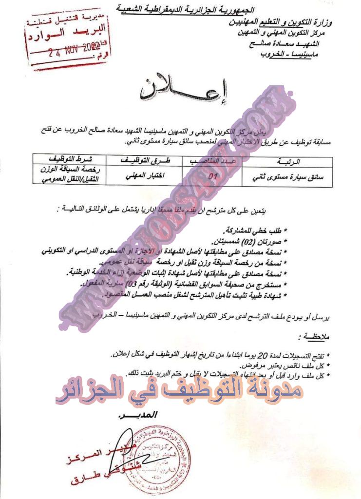 يعلن مركز التكوين المهني والتمهين ماسينيسا الخروب عن فتح مسابقة توظيف عن طريق الاختبار المهني في الرتب المبينة ادناه