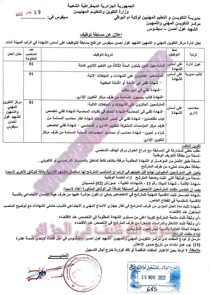 تعلن ادارة مركز التكوين المهني والتمهين لولاية ام البواقي عن فتح مسابقة توظيف على اساس الشهادة في الرتب المبينة ادناه