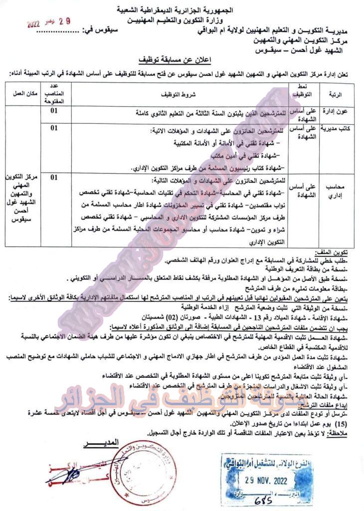 تعلن ادارة مركز التكوين المهني و التمهين الشهيد غول احسن سيقوس عن فتح مسابقة توظيف على اساس الشهادة في الرتب المبينة ادناه