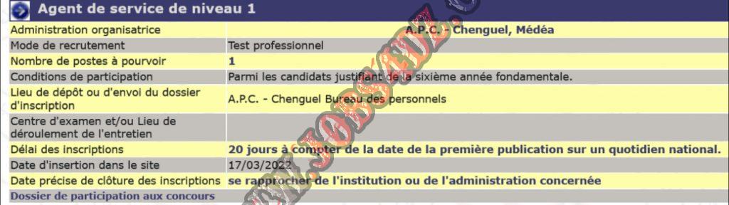 مكان إيداع أو إرسال الملفات : A.P.C. – Chenguel Bureau des personnels