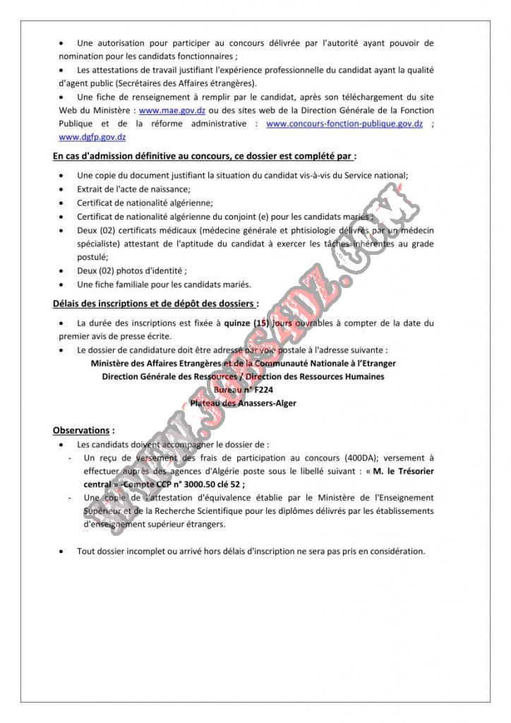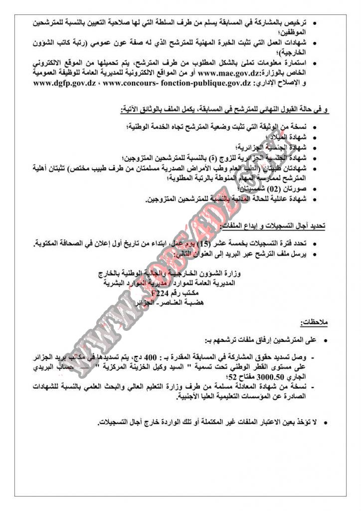 يرسل ملف المشاركة الى العنوان البريدي وزارة الشؤون الخارجية و الجالية الوطنية بالخارج المديرية العامة للموارد / مديرية الموارد البشرية مكتب رقم F 224 هضبة العناصر – الجزائرآجال الإيداع 15 يوما من تاريخ النشر في الجرائد اليومية