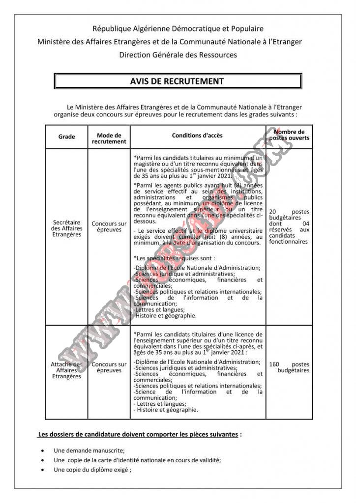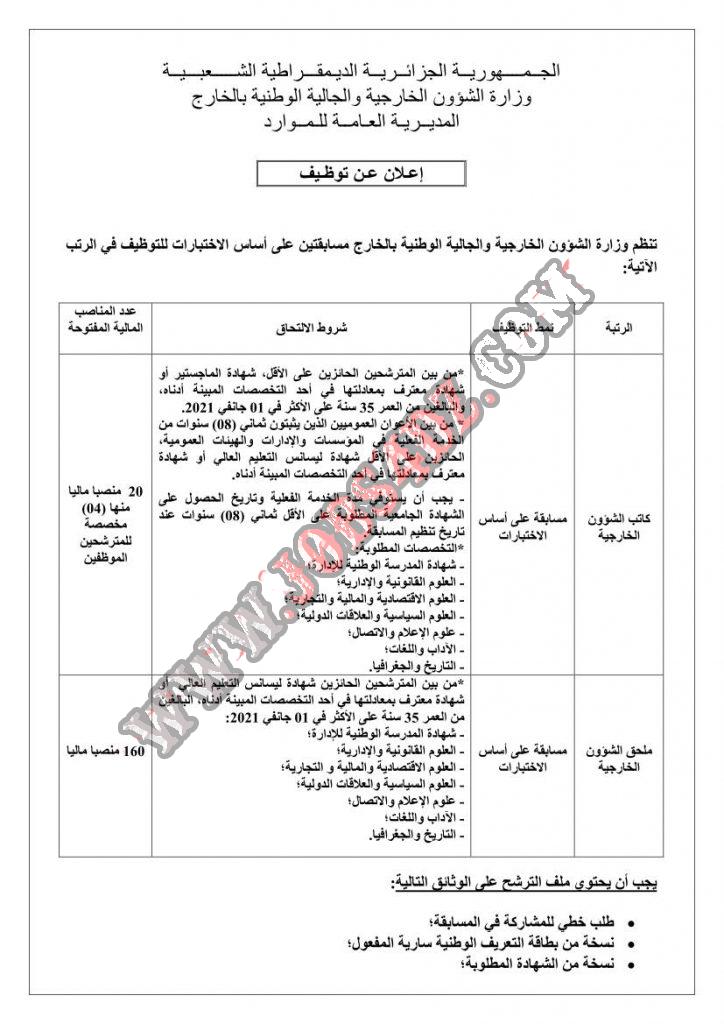 تنظم وزارة الشؤون الخارجية والجالية الوطنية بالخارج مسابقتين على اساس الاختبارات للتوظيف في الرتب الاتية
