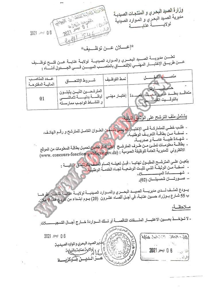 تعلن مديرية الصيد البحري والموارد الصيدية لولاية عنابة عن فتح مسابقة توظيف عن طريق الاختبار المهني للالتحاق بالمناصب المبينة ادناه