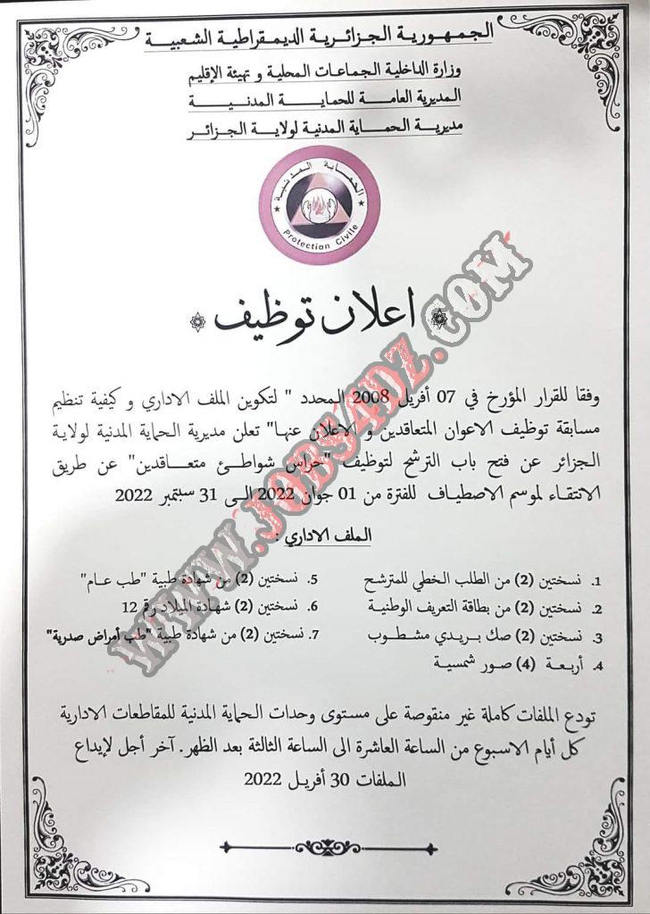 تعلن مديرية الحماية المدنية لولاية الجزائر عن فتح باب الترشح لتوظيف حراس شواطئ متعاقدين عن طريق الانتقاء لموسم الاصطياف للفترة من 01 جوان 2022 الى 31 سبتمبر 2022