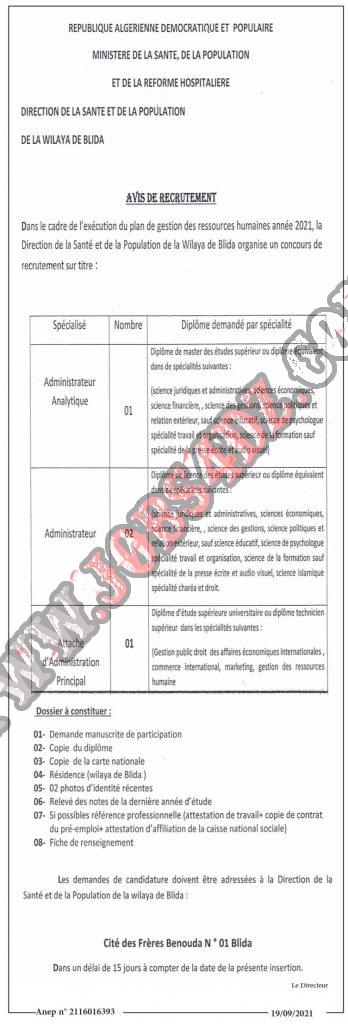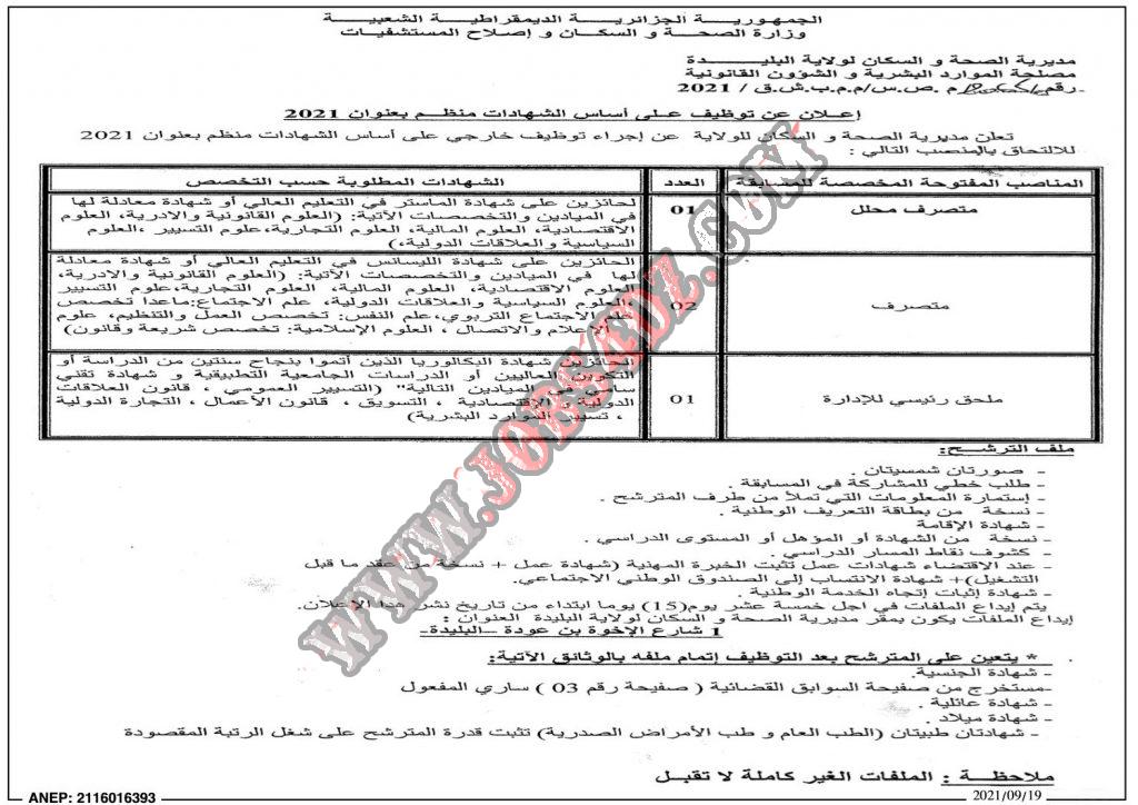 تعلن مديرية الصحة والسكان للولاية عن اجراء توظيف خارجي على اساس الشهادات منظم بعنوان 2021 للالتحاق بالمناصب التالية