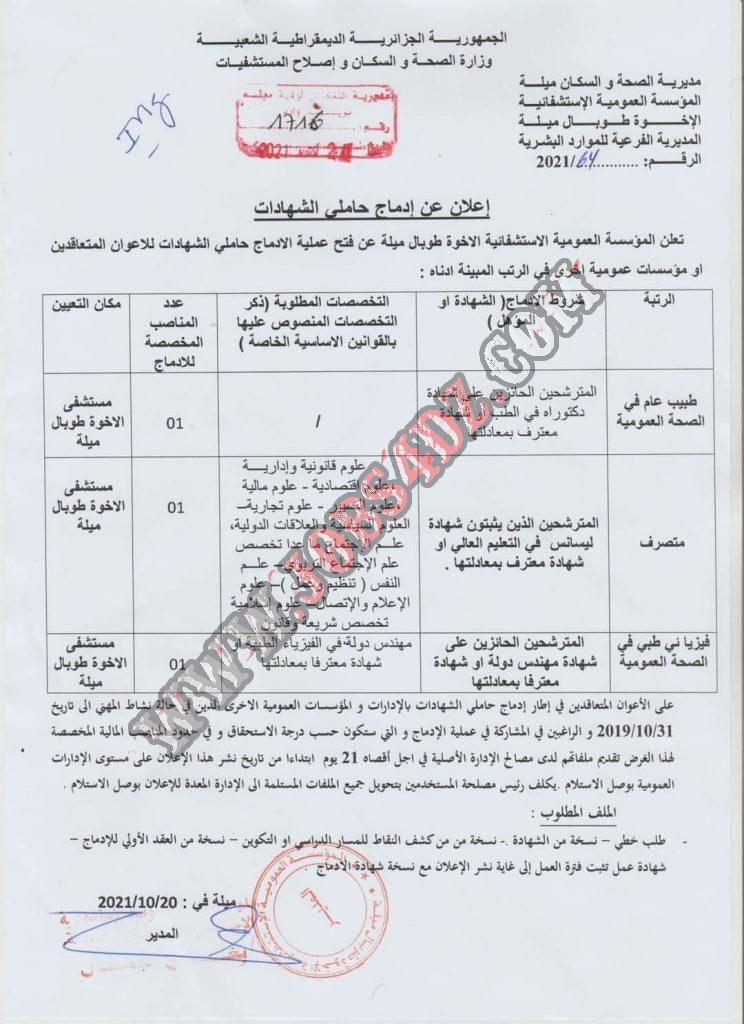 اعلان عن ادماج حاملي الشهادات بالمؤسسة العمومية الاستشفائية الاخوة طوبال ميلة