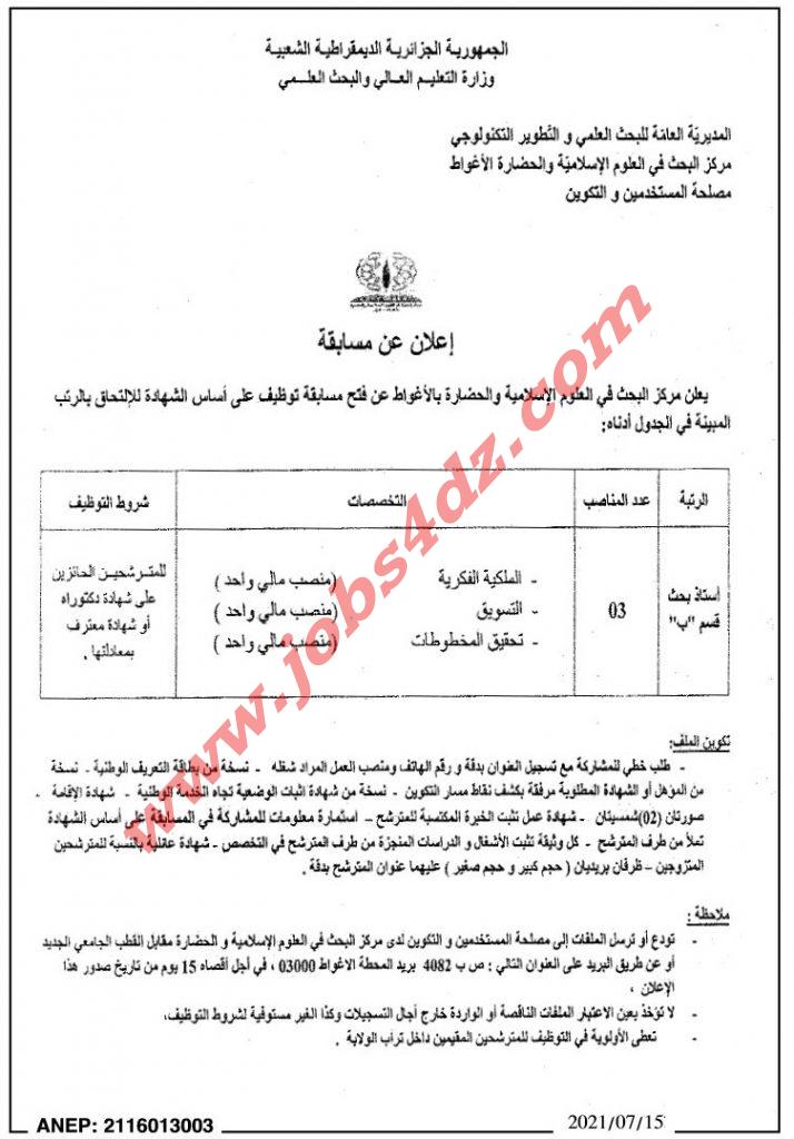 يعلن مركز البحث في العلوم الاسلامية والحضارة بالاغواط عن فتح مسابقة توظيف على اساس الشهادة للالتحاق بالرتب المبينة ادناه