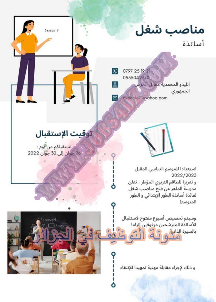 استعدادا للموسم الدراسي المقبل2022/2023 و تعزيزا للطاقم التربوي المؤطر ، تعلن مدرسة الماهر عن فتح مناصب شغل لفائدة أساتذة الطور الإبتدائي و الطور المتوسط.