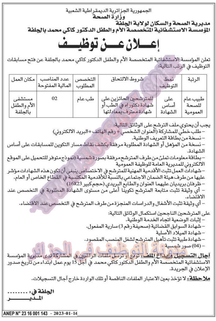 تعلن المؤسسة الاستشفائية الام والطفل بالجلفة عن فتح مسابقة توظيف على اساس الشهادة في الرتب المبينة ادناه