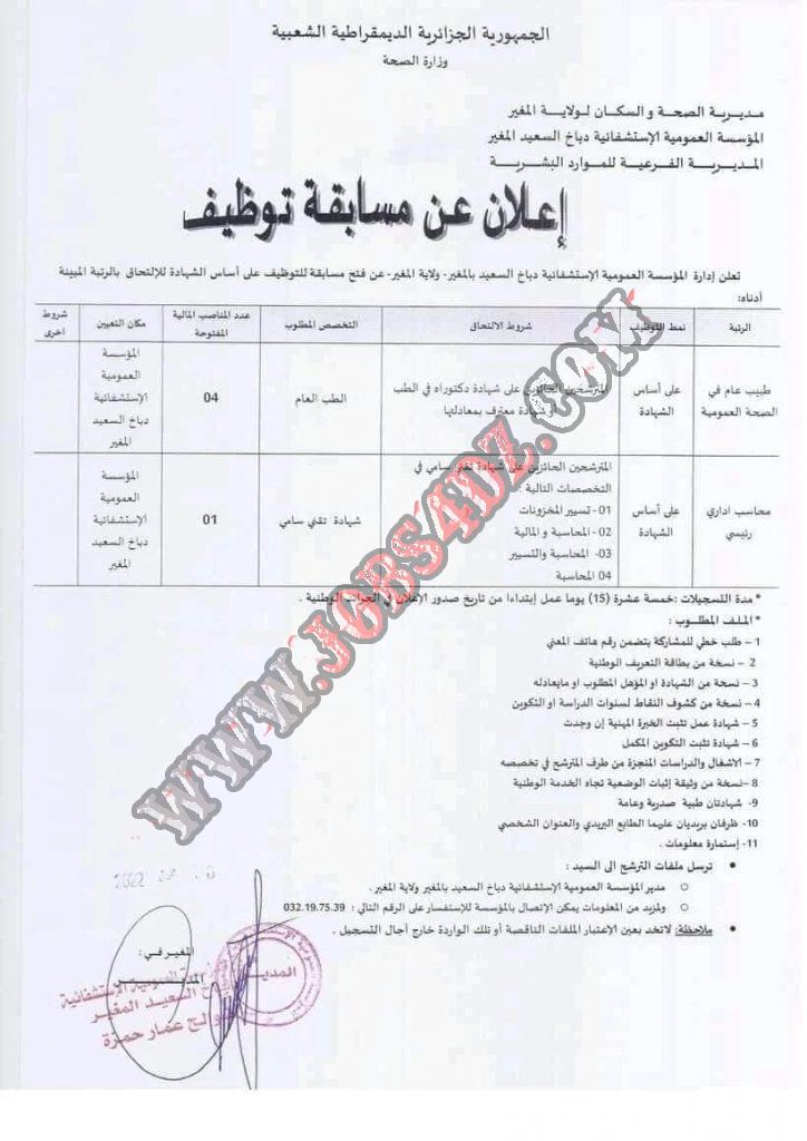 تعلن ادارة اعلان عن توظيف بالمؤسسة العمومية الاستشفائية دباخ السعيد بولاية المغير عن مسابقة توظيف على اساس الشهادة للالتحاق بالرتب المبينة ادناه