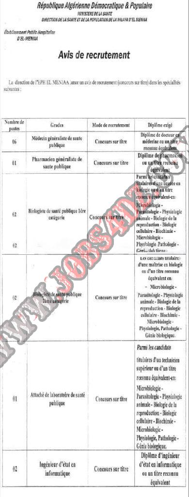 تعلن المؤسسة العمومية الاستشفائية المنيعة عن فتح مسابقة توظيف على اساس الشهادات في المناصب المبينة ادناه