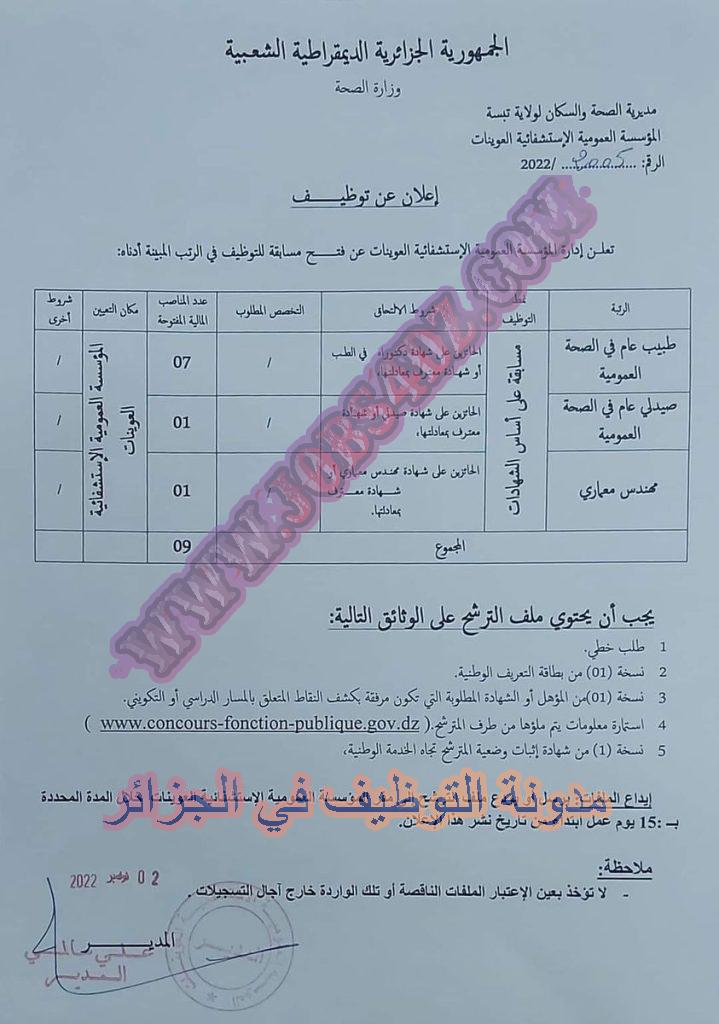تعلن المؤسسة العمومية الاستشفائية العوينات عن فتح توظيف خارجي على اساس الشهادة في الرتب المبينة ادناه