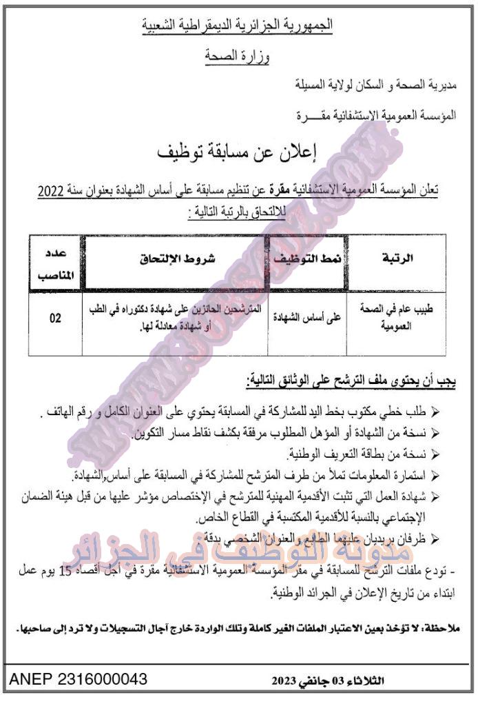 تعلن المؤسسة العمومية الاستشفائية مقرة بالمسيلة عن فتح مسابقة توظيف على اساس الشهادة في الرتب المبينة ادناه