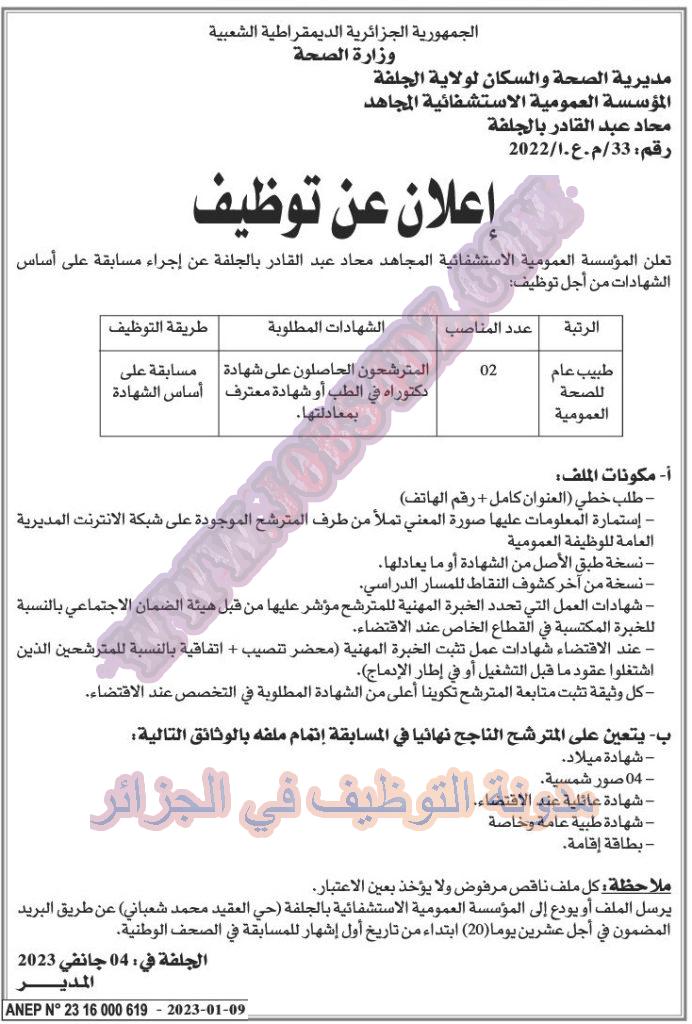 تعلن المؤسسة العمومية الاستشفائية محاد عبد القادر بالجلفة عن فتح مسابقة توظيف على اساس الشهادة في الرتب المبينة ادناه