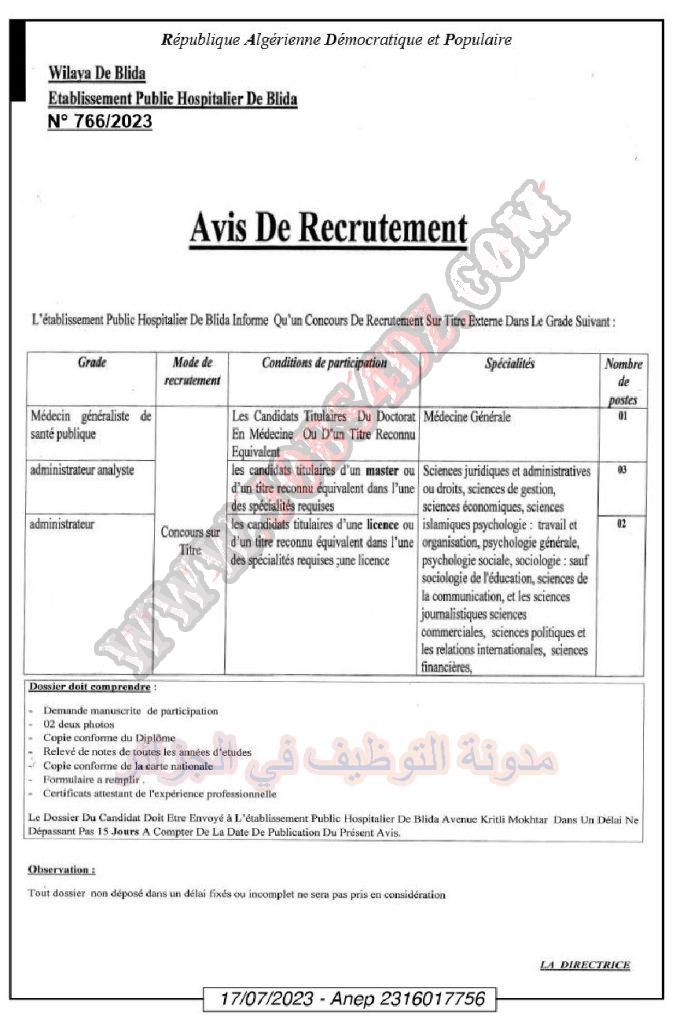 تعلن المؤسسة العمومية الاستشفائية العفرون البليدة عن فتح مسابقة توظيف على اساس الشهادة في الرتب المبينة ادناه