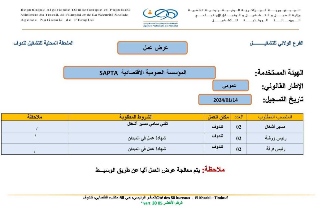 اعلان عن توظيف بالمؤسسة العمومية الاقتصادية SAPTA شاركها Facebook Twitter LinkedIn Pinterest الفرع الولائي للتشغيـل
