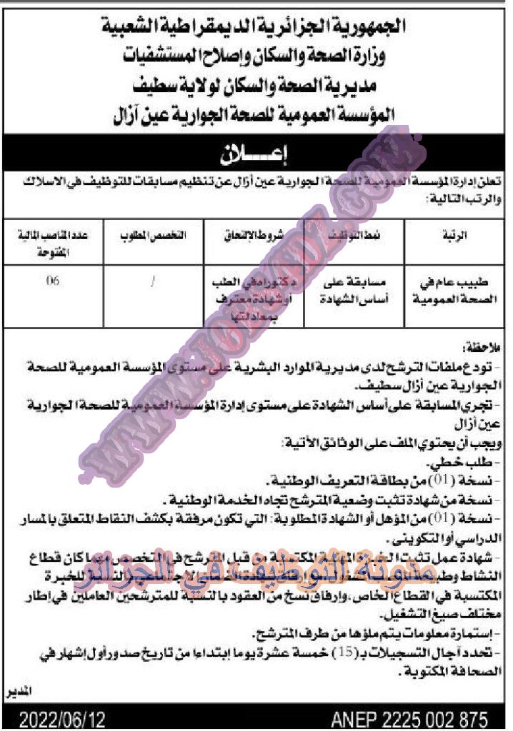 تعلن المؤسسة العمومية للصحة الجوارية عين ازال سطيف عن فتح مسابقة توظيف على اساس الشهادة في المناصب المبينة ادناه