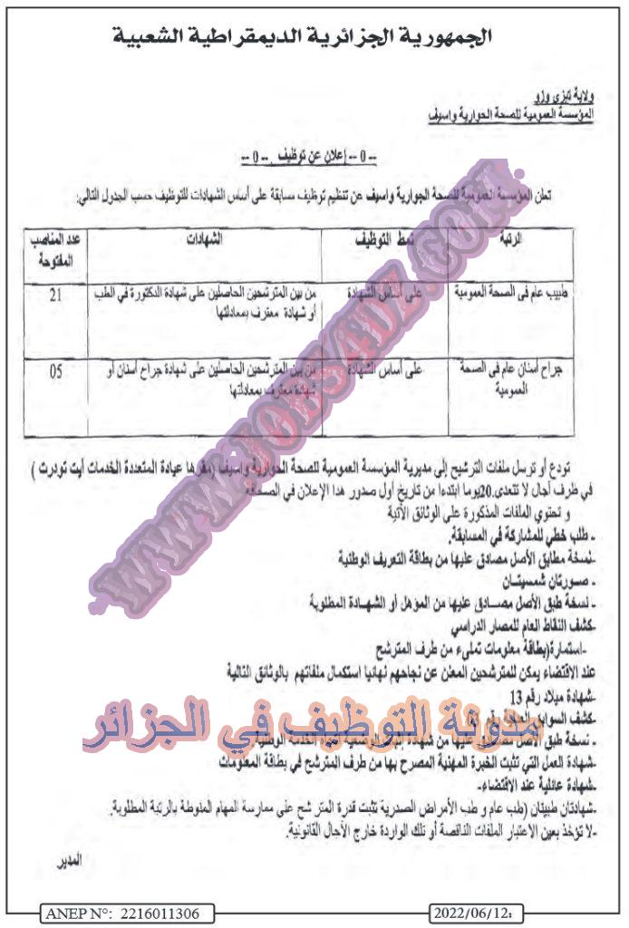 تعلن المؤسسة العمومية للصحة الجوارية واسيف تيزي وزو عن فتح مسابقة توظيف على اساس الشهادة في المناصب المبينة ادناه