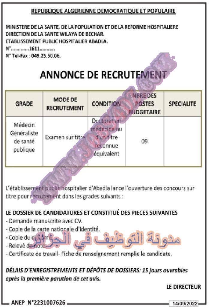 تعلن المؤسسة العمومية للصحة الجوارية العبادلة ولاية بشار عن فتح مسابقة توظيف على اساس الشهادة في الرتب المبينة ادناه