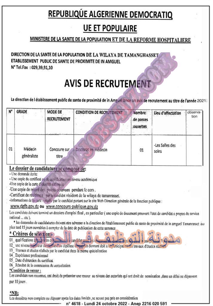 تعلن إدارة المؤسسة العمومية للصحة الجوارية تمنراست عن فتح توظيف على اساس الشهادة في الرتب المبينة ادناه