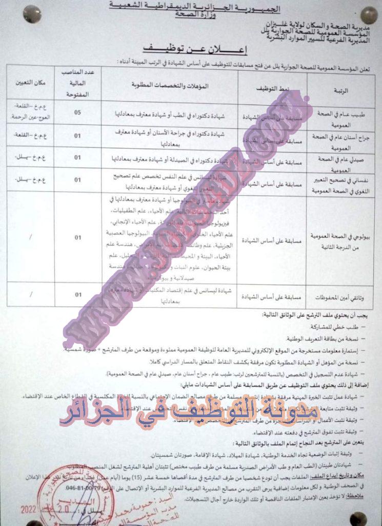 تعلن المؤسسة العمومية للصحة الجوارية يلل عن فتح مسابقة توظيف على اساس الشهادة في الرتب المبينة ادناه