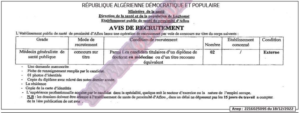 تعلن المؤسسة العمومية للصحة الجوارية افلو عن فتح مسابقة توظيف على اساس الشهادة في الرتب المبينة ادناه