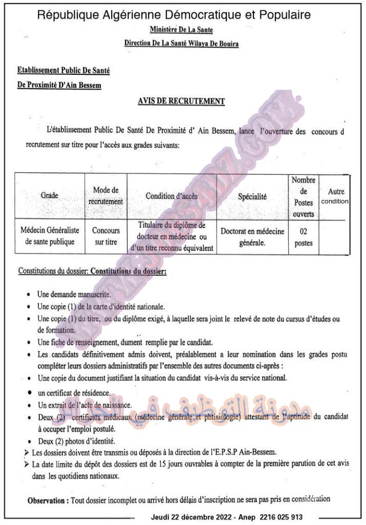 تعلن المؤسسة العمومية للصحة الجوارية عين بسام البويرة عن فتح مسابقة توظيف على اساس الشهادة في الرتب المبينة ادناه