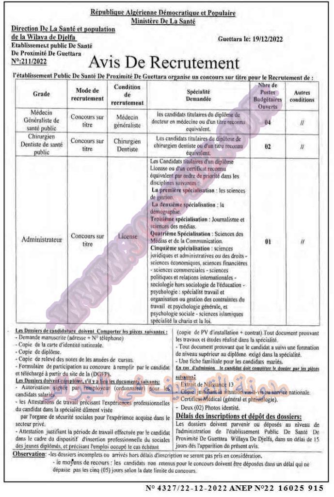تعلن المؤسسة العمومية للصحة الجوارية بقطارة الجلفة عن فتح مسابقة توظيف على اساس الشهادة في الرتب المبينة ادناه