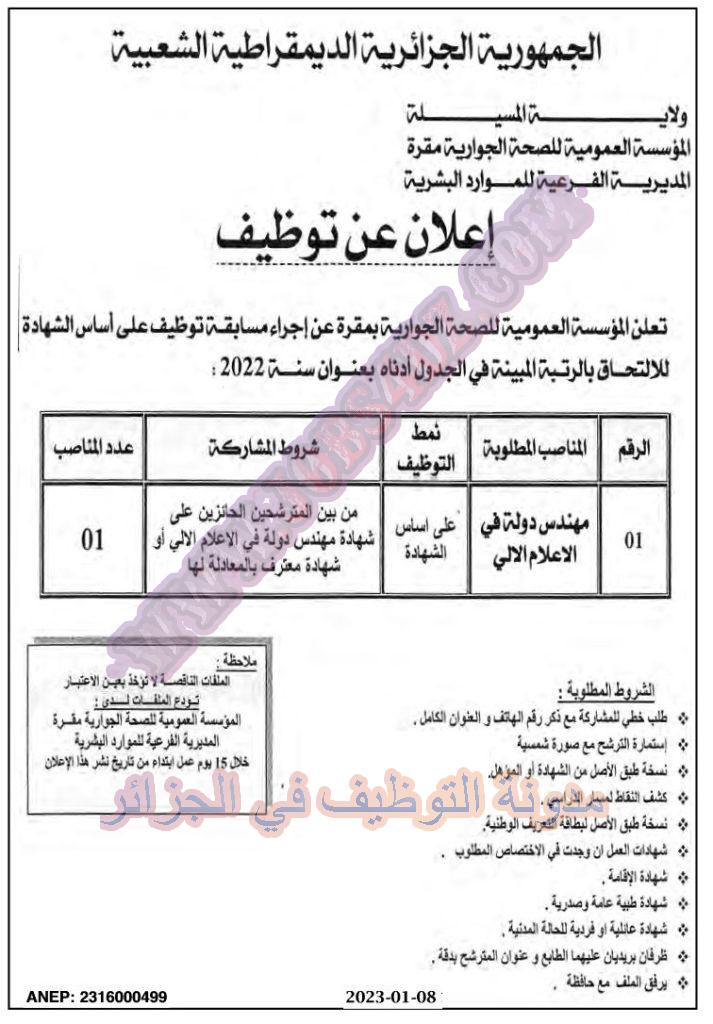تعلن المؤسسة العمومية للصحة الجوارية بمقرة المسيلة عن فتح مسابقة توظيف على اساس الشهادة في الرتب المبينة ادناه