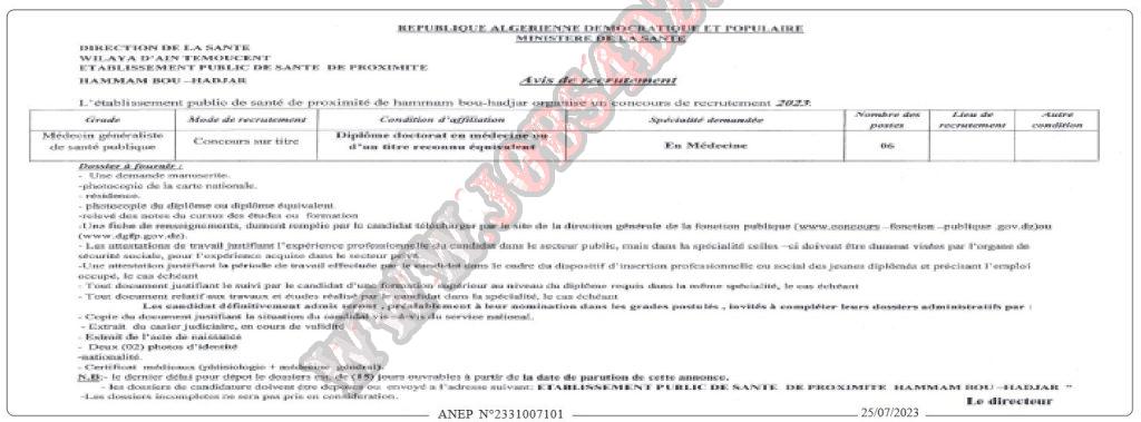 اعلان عن توظيف بالمؤسسة العمومية للصحة الجوارية حمام بوحجر