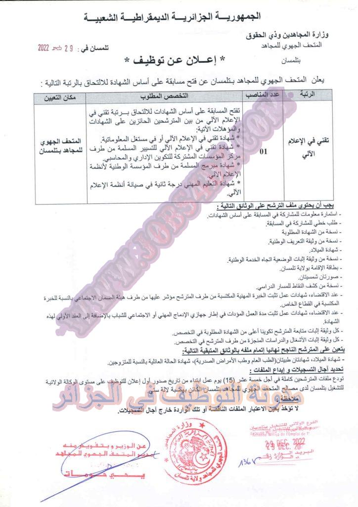 يعلن المتحف الجهوي للمجاهد لولاية تلمسان عن فتح مسابقة توظيف على اساس الشهادة في الرتب المبينة ادناه