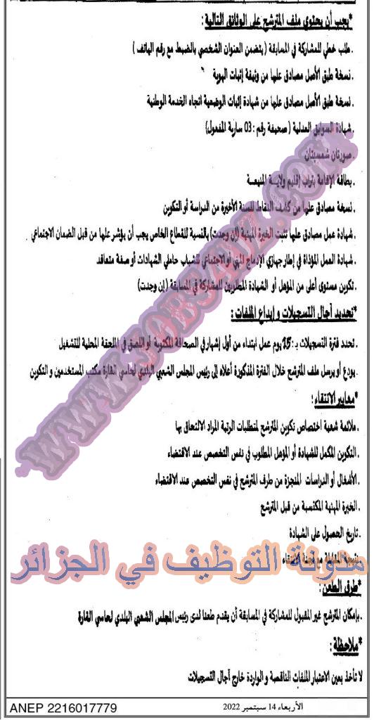 يعلن رئيس المجلس الشعبي البلدي حاسي القارة عن فتح مسابقة توظيف على اساس الشهادة في الرتب المبينة ادناه