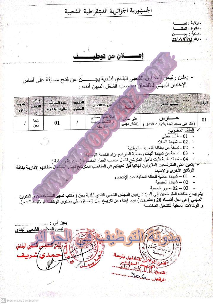 يعلن رئيس المجلس الشعبي البلدي لبلدية بجن ولاية تبسة عن فتح مسابقات توظيف على اساس الاختبار المهني في الرتب المبينة ادناه