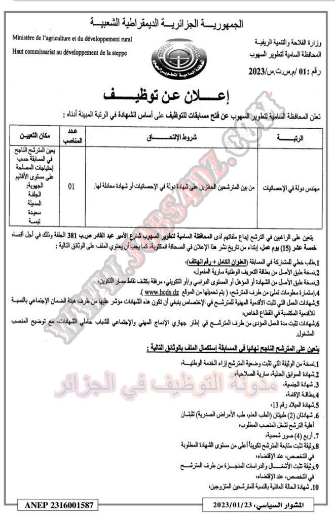 تعلن المحافظة السامية لتطوير السهوب لولاية الجلفة عن فتح مسابقة توظيف على اساس الشهادة في الرتب المبينة ادناه