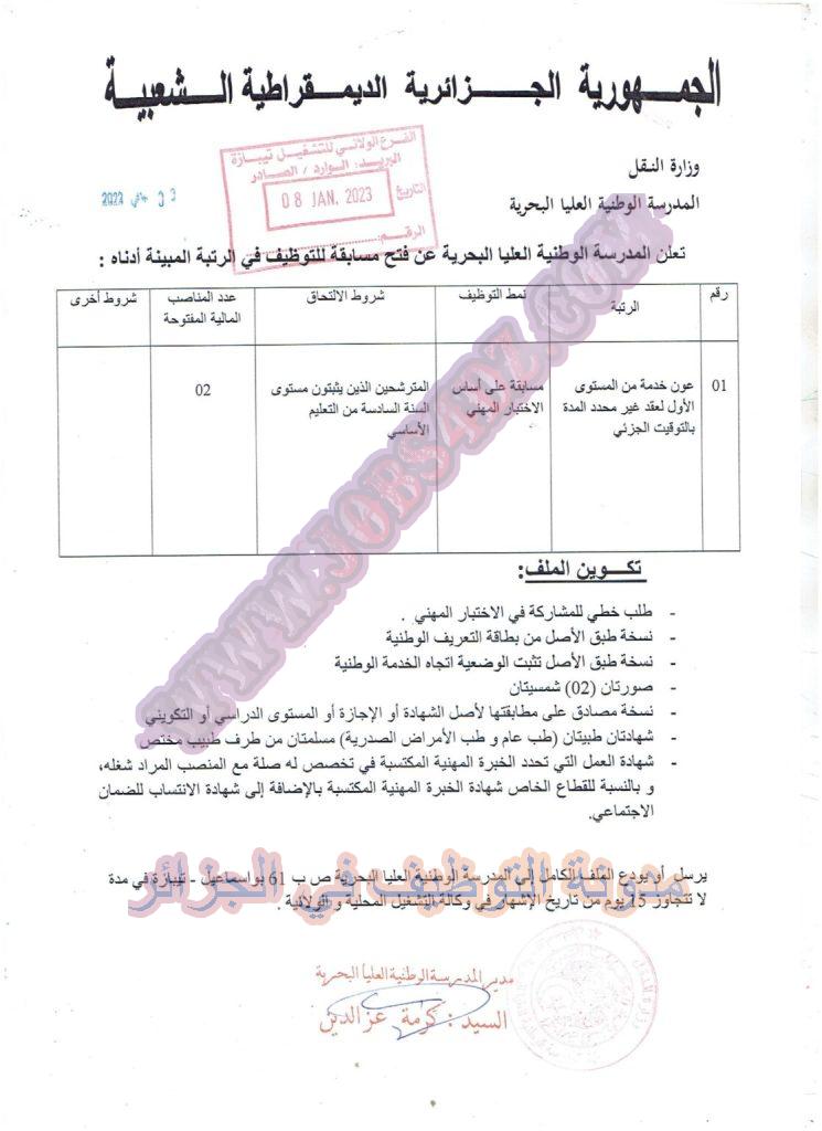 تعلن المدرسة العليا البحرية بتيبازة عن فتح مسابقة توظيف على اساس الاختبار المهني في الرتب المبينة ادناه