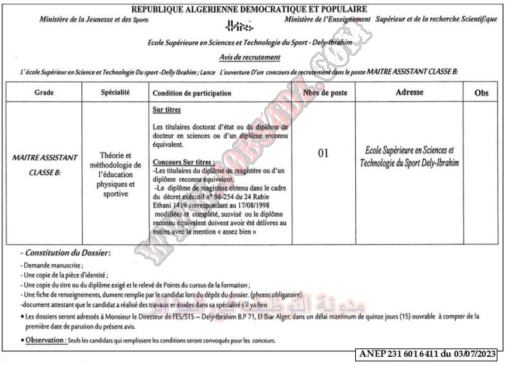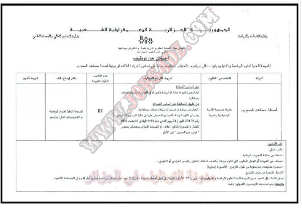 تعلن المدرسة العليا لعلوم الرياضة وتكنولوجياتها بدالي ابراهيم عن فتح مسابقة توظيف على اساس الشهادة في الرتب المبينة ادناه