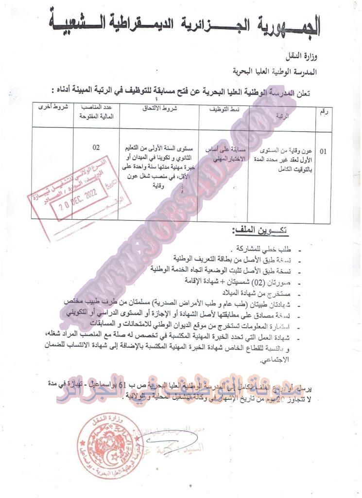 تعلن المدرسة الوطنية العليا البحرية عن فتح مسابقة توظيف على اساس الاختبار مهني في الرتب المبينة ادناه