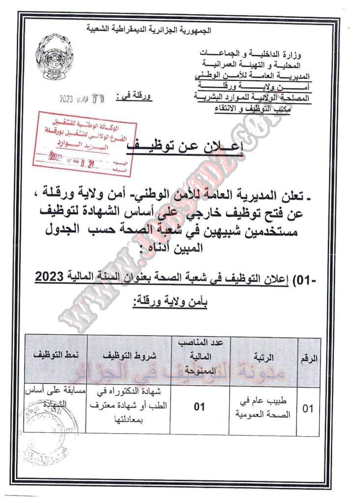 تعلن المديرية العامة للامن الوطني لولاية ورقلة عن فتح مسابقة توظيف على اساس الشهادة في الرتب المبينة ادناه