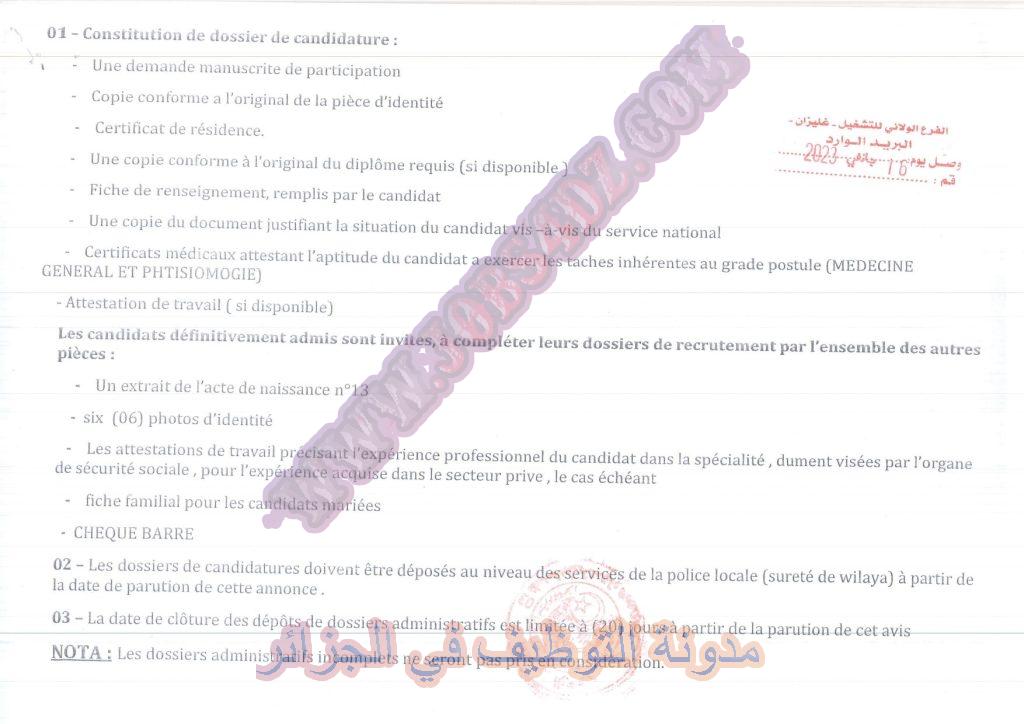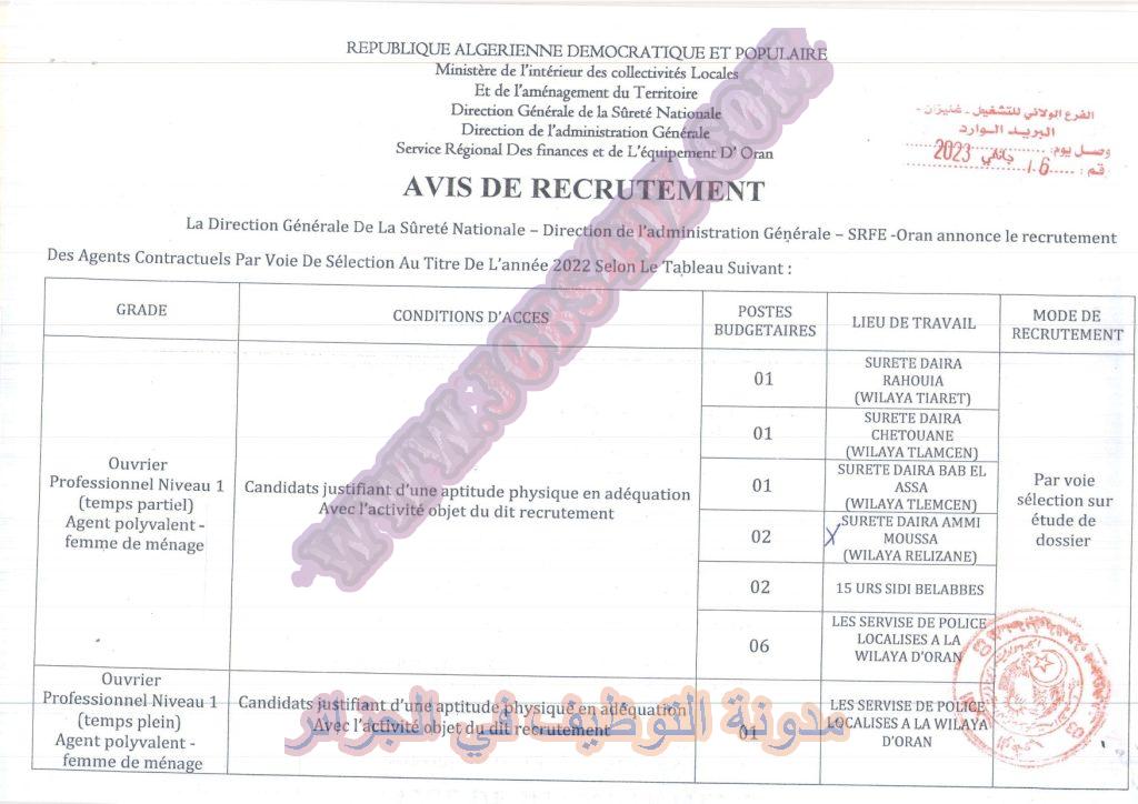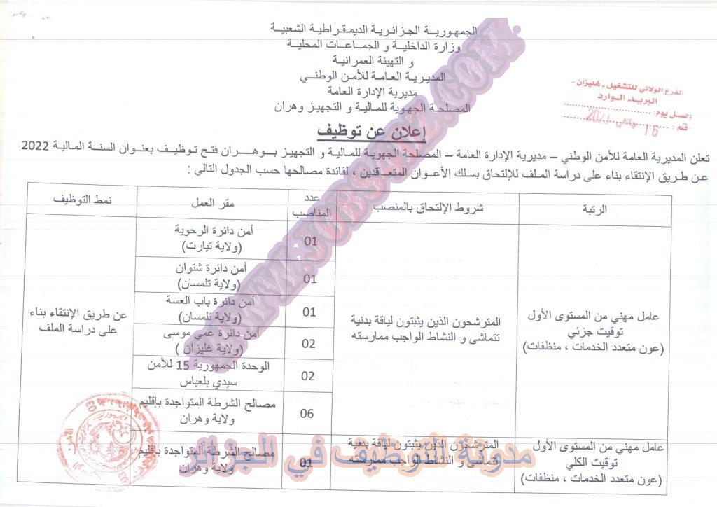 تعلن المديرية العامة للامن الوطني مديرية الادارة العامة – المصلحة الجهوية بوهران عن فتح مسابقة توظيف على اساس الانتقاء في الرتب المبينة ادناه