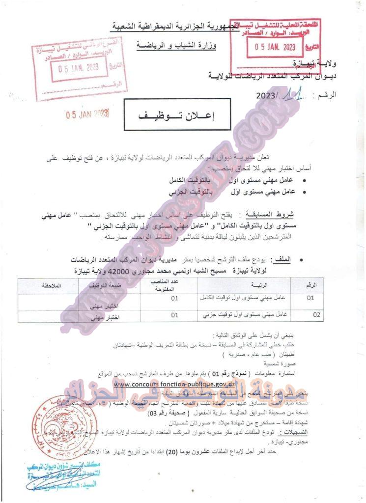 تعلن مديرية ديوان المركب المتعدد الرياضات لولاية تيبازة عن فتح مسابقة توظيف على اساس الاختبار المهني في الرتب المبينة ادناه