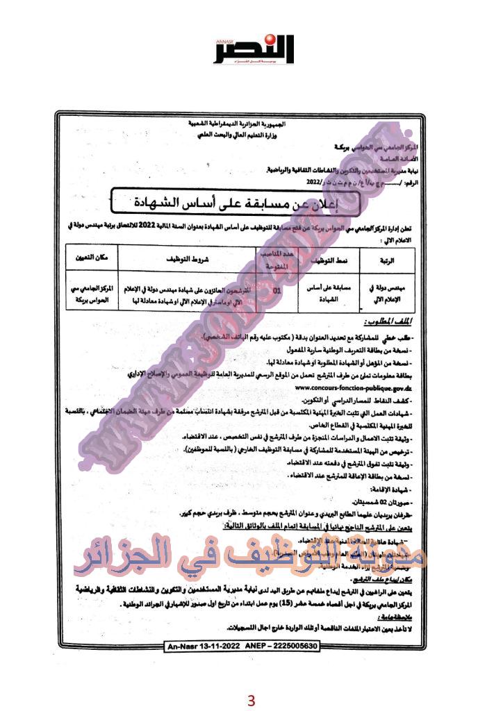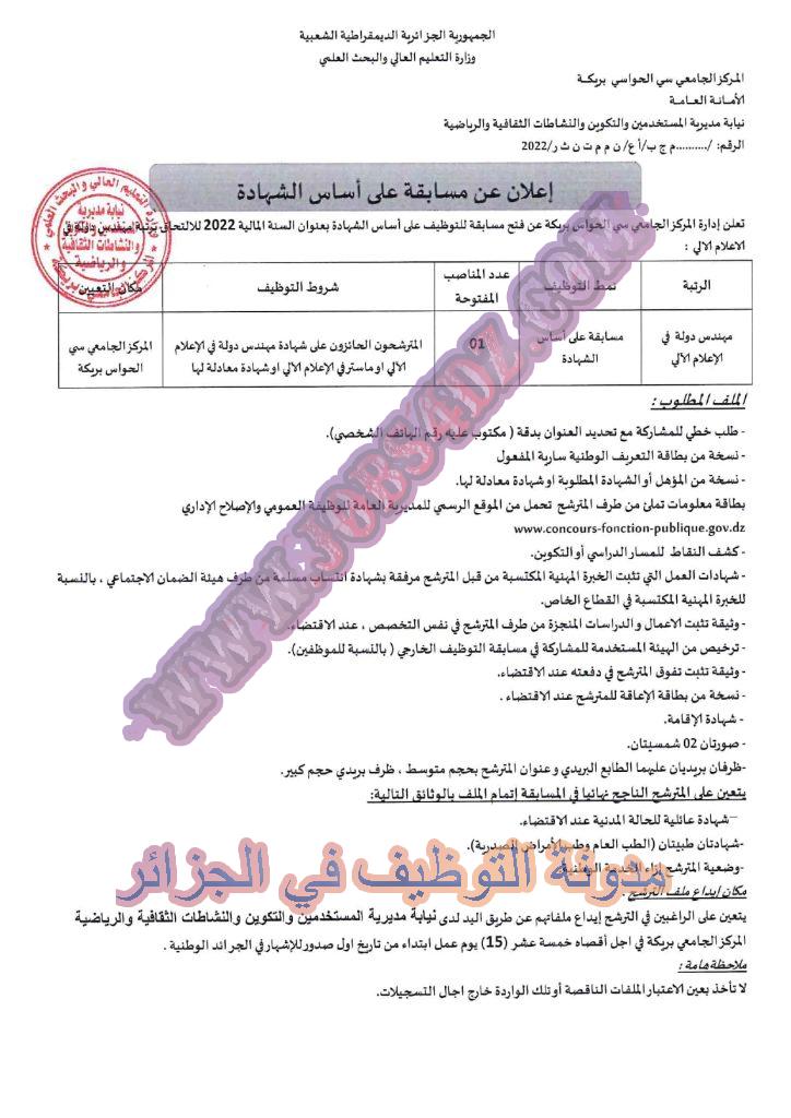 تعلن المركز الجامعي سي الحواس بريكة باتنة عن فتح مسابقات توظيف على اساس الشهادة في الرتب المبينة ادناه