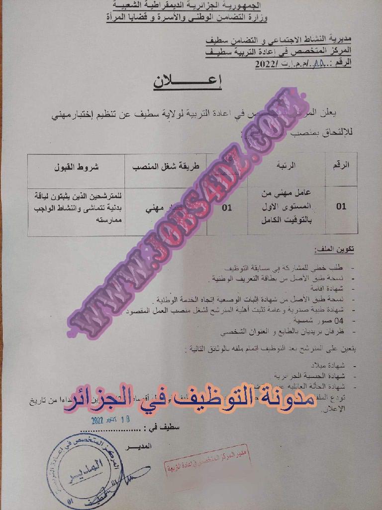 يعلن المركز المتخصص في اعادة التربية لولاية سطيف عن فتح توظيف على اساس الاختبار المهني في الرتب المبينة ادناه