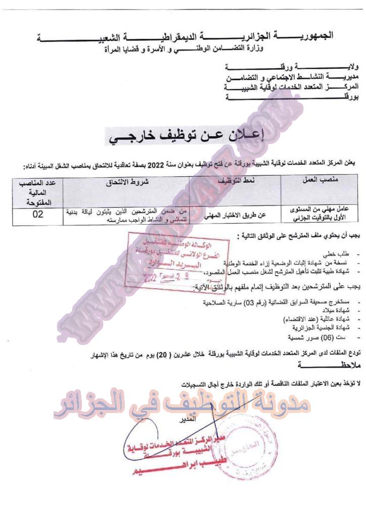 يعلن المركز النتعدد الخدمات لوقاية الشبيبة بورقلة عن فتح مسابقة توظيف عن طريق الاختبار المهني في الرتب المبينة ادناه