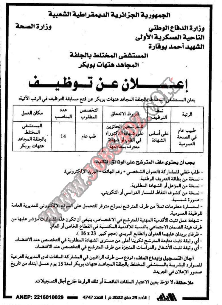 يعلنالمستشفى المختلط بالجلفة المجاهد هتهات بوبكر عن توظيف على اساس الشهادة في المناصب المبينة ادناه