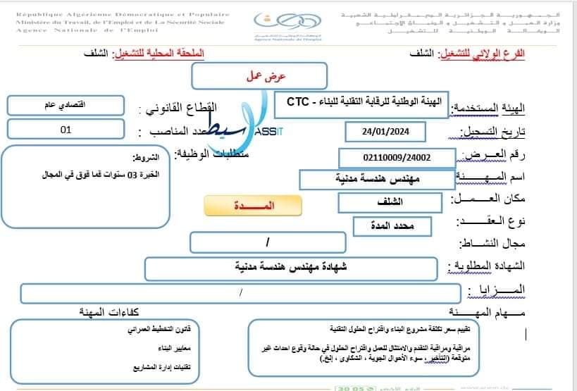 تعلن الملحقة المحلية للتشغيل الشلف عن عرض عمل بالهيئة الوطنية للرقابة التقنية للبناء – CTC كما هو موضح ادناه