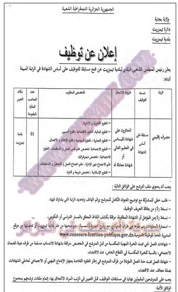 تعلن رئيس المجلس الشعبي البلدي لبلدية تيمزريت عن فتح مسابقة توظيف على اساس الشهادة في الرتب المبينة ادناه