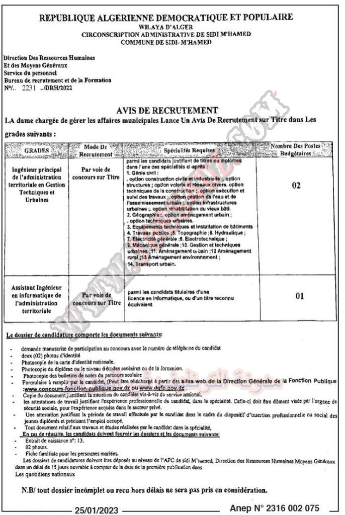 تعلن سيدي محمد عن فتح مسابقة توظيف على اساس الشهادة في الرتب المبينة ادناه