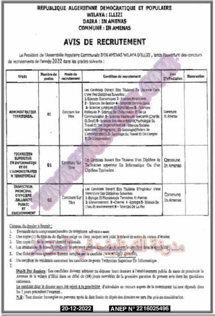 يعلن رئيس المجلس الشعبي البلدي لبلدية عين اميناس بايليزي عن فتح مسابقة توظيف على اساس الشهادة في الرتب المبينة ادناه