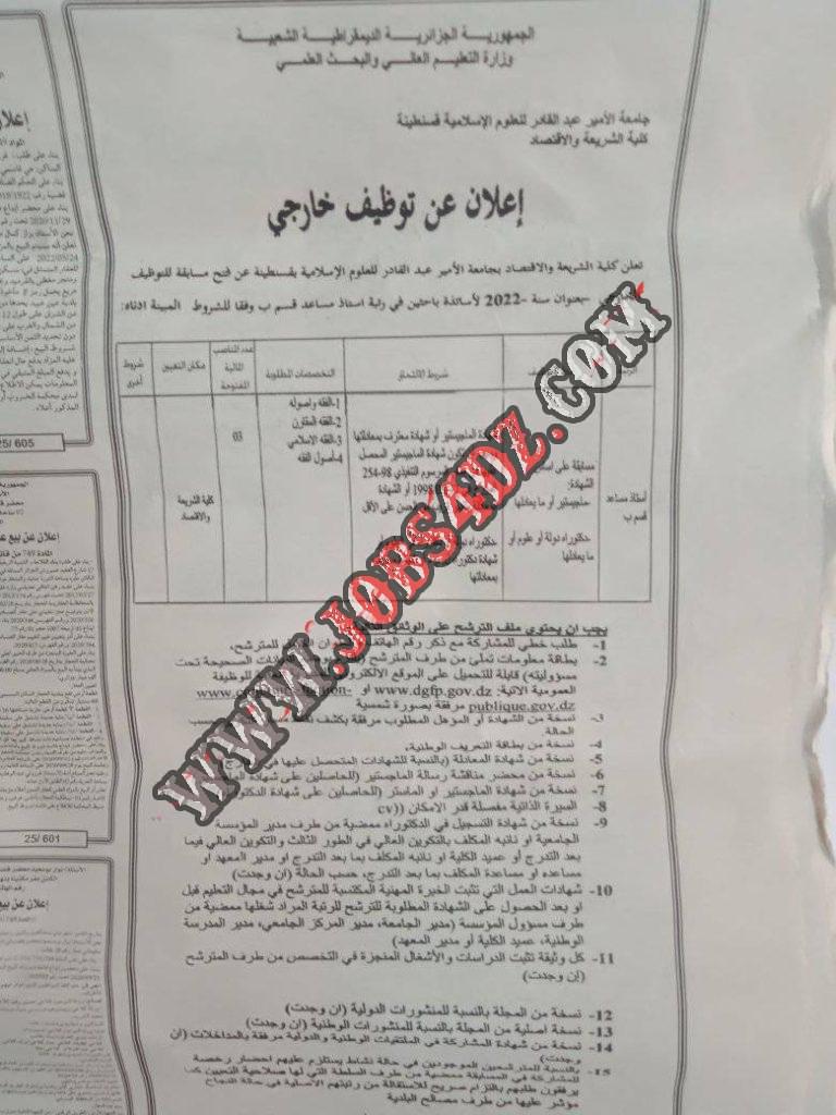 اعلان عن توظيف بجامعة الامير عبد القادر للعلوم الاسلامية قسنطينة